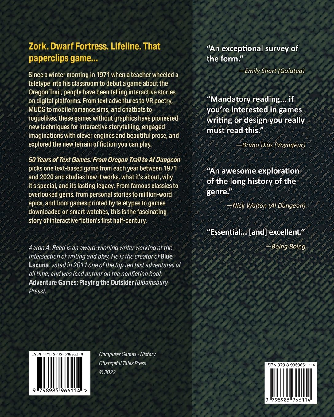 Since a winter morning in 1971 when a teacher wheeled a teletype into his classroom to debut a game about the Oregon Trail, people have been telling interactive stories on digital platforms. From text adventures to VR poetry, MUDS to mobile romance sims, and chatbots to roguelikes, these games without graphics have pioneered new techniques for interactive storytelling, engaged imaginations with clever engines and beautiful prose, and explored the new terrain of fiction you can play.50 Years of Text Games: From Oregon Trail to AI Dungeon picks one text-based game from each year between 1971 and 2020 and studies how it works, what it's about, why it's special, and its lasting legacy. In-depth chapters dive into classics like Zork, Trade Wars, and Hitchhiker's Guide; beloved fan games like Galatea and Photopia; wild experiments from Dwarf Fortress to Howling Dogs; and breakout hits like 80 Days, Fallen London, and Lifeline. From personal stories to million-word epics, from games printed by teletypes to games downloaded on smart watches, this is the fascinating story of interactive fiction’s first half-century.